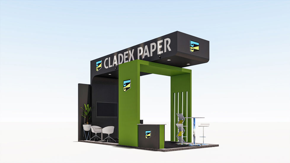 This project showcases various exhibition booths featuring Cladex Paper products and branding. The booths are designed with modern elements and vibrant green accents, creating an inviting and professional atmosphere.